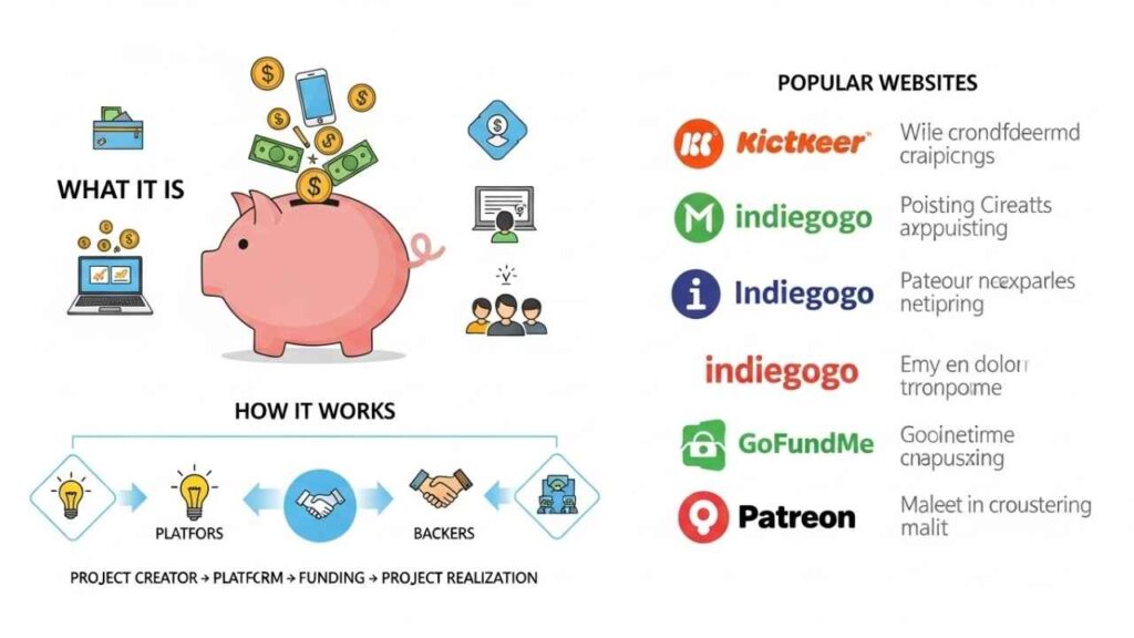 Crowdfunding is a method of raising money by collecting small amounts from a large number of people, usually through the internet. Think of it as the opposite of traditional financing, where you might ask one bank or investor for all the money you need. Instead, crowdfunding lets you ask hundreds or thousands of people to each contribute a small amount.